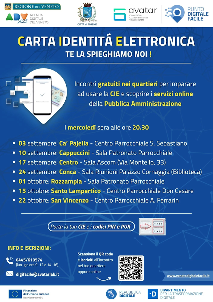 Commenta l’Assessora all’URP Marina Maino: «Proponiamo alla Cittadinanza incontri informativi nei Quartieri per aiutare i cittadini a comprendere e ad utilizzare al meglio gli strumenti digitali offerti dalla Pubblica Amministrazione, in particolare la Carta d’Identità Elettronica (CIE) e l’Identità Digitale. Il nostro obiettivo è quello di superare il divario digitale e rendere i servizi pubblici accessibili a tutti. Personale dell’URP e del Servizio Civile Digitale illustreranno con un linguaggio semplice e chiaro le procedure per l’attivazione dell’Identità Digitale tramite CIE e assisteranno i cittadini con un esempio pratico di accesso ai principali servizi on line. Desideriamo che i thienesi si sentano a proprio agio con il Digitale perché l’innovazione tecnologica possa essere un’effettiva opportunità per tutti e non un ostacolo».
